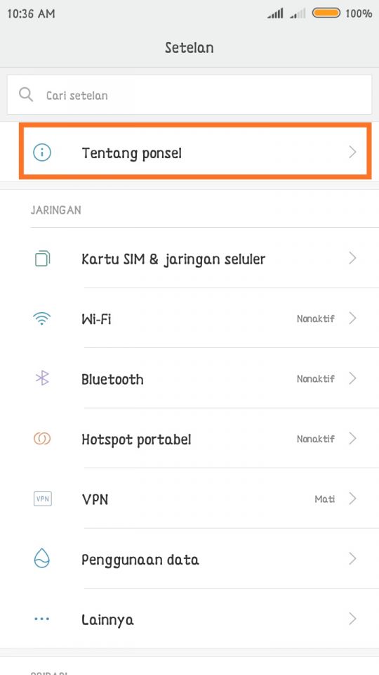 1. Pertama, masuk ke menu setelan (settings) – Tap menu Tentang Ponsel (about phone).