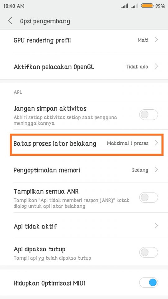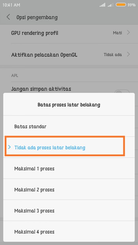 4. Setelah masuk di menu opsi pengembang anda akan dihadapkan dengan begitu banyak pengaturan, lalu scroll ke bawah sampai menemukan pengaturan di kelompok APL – Tap batas proses latar belakang – kemudian pilih tidak ada proses latar belakang.