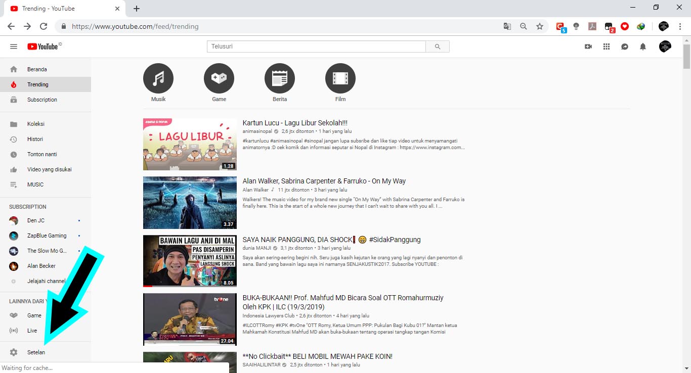 2. Pada halaman sebelah kiri Youtube, kamu akan menemukan menu SETELAN. Klik SETELAN.