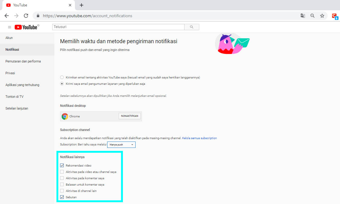 4. Selanjutnya, klik tanda centang yang ada di kolom NOTIFIKASI LAINNYA. Kamu bisa mengatur notifikasi yang masuk sesuai kebutuhan. Contoh: Rekomendasi Video dan Sebutan.