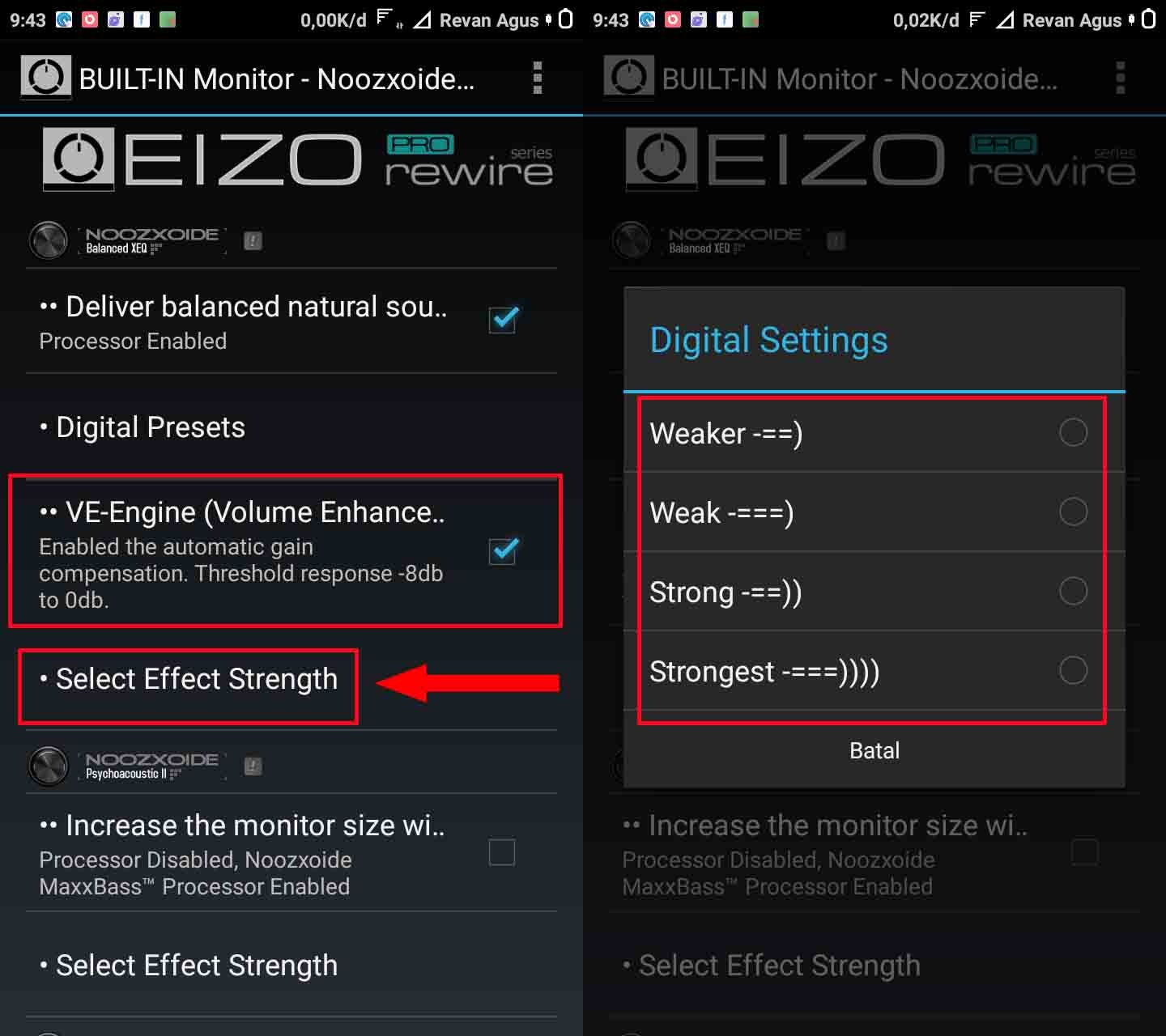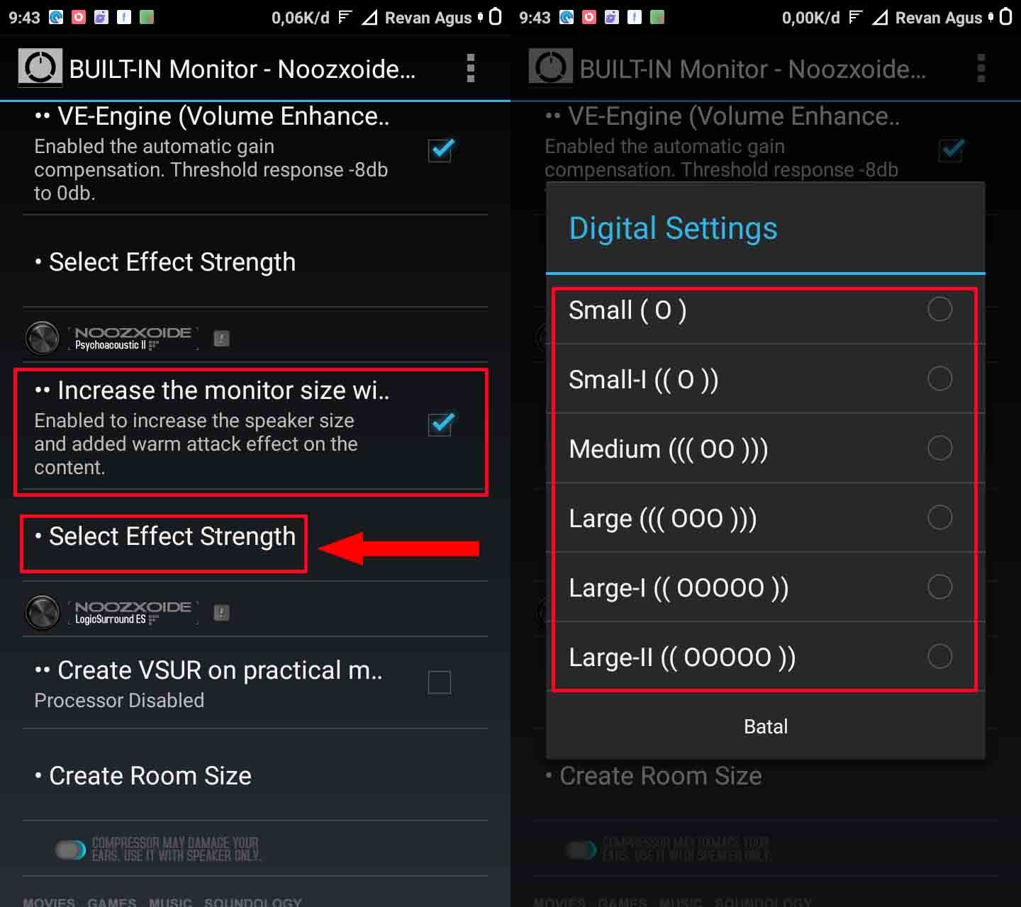 Langkah keenam, Tap ceklis pada Increase the monitor size selanjutnya â Tap Select Effect Strength pilih lagi efek suaranya yang pas di telinga kamu.