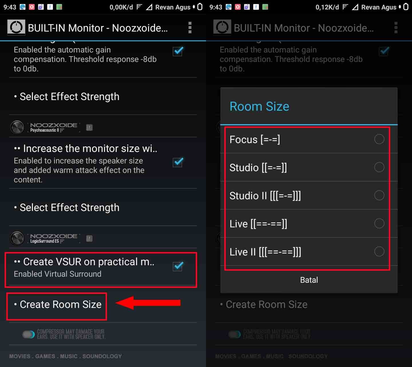 Langkah ketujuh, Tap ceklis pada CREATE VSURÂ â Tap Create Room Size dan dengarkan efeknya dan sesuaikan dengan yang nyaman di telinga kamu.