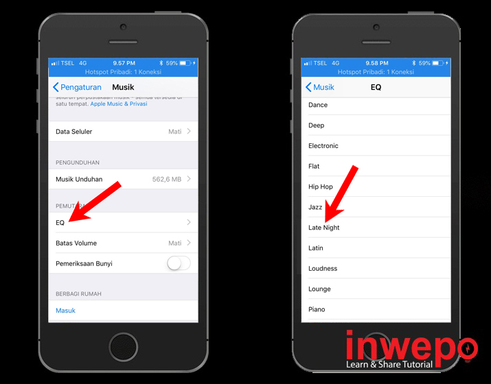 Catatan: Setiap EQ yang dipilih, akan terdengar berbeda ketika kamu memilih beberapa jenis musik. Tetapi untuk Late Night, akan meningkatkan suara musik dan bisa digunakan untuk semua jenis musik yang kamu pilih.