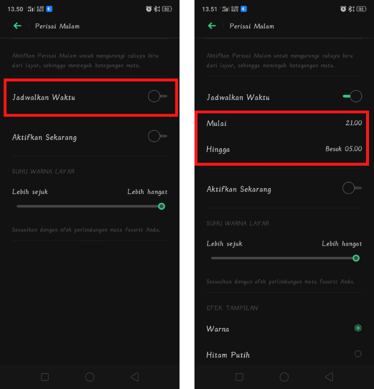 3. Pada halaman Dark Mode atau Perisai Malam, kamu cukup aktifkan fitur Jadwalkan Waktu. Sekarang kamu hanya perlu mengatur waktu aktif tampilan dark mode atau perisai malam di layar HP Android kamu. atur waktu mulai otomatis tampilan dark mode dan atur waktu selesai otomatis tampilan dark mode di HP Android kamu. Selesai.