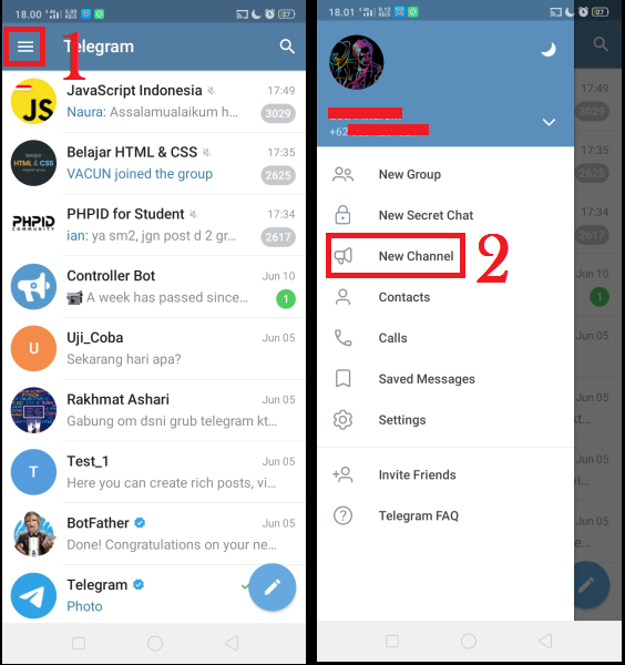 2. Buka aplikasi Telegram, dan buat channel di Telegram. Klik ikon tiga garis, dan pilih menu ‘New Channel’.