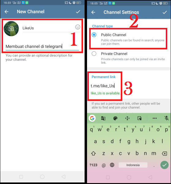 Buat nama channel, tambahkan deskripsi channel, dan tambahkan foto channel. Klik centang. Pilih pengaturan ‘Public Channel’, dan buat alamat link permanen. Klik centang. Sekarang channel baru sudah jadi.