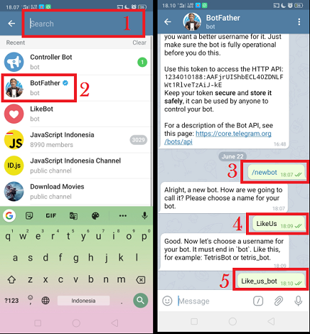 3. Kembali ke menu awal utama Telegram, Klik icon ‘Cari’ di pojok kanan atas. Cari dan pilih ‘BotFather’. Ketikkan /newbot untuk membuat bot baru. Buat nama bot dan username yang akan digunakan. Untuk membuat username, harus diakhiri dengan ‘bot’.