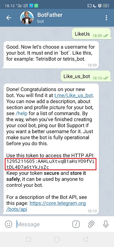 Selesai, sekarang bot baru sudah selesai dibuat. Copy token akses bot.