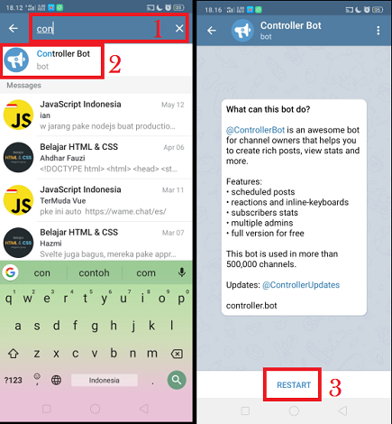 4. Kembali ke menu awal utama Telegram, Klik icon ‘Cari’ di pojok kanan atas. Cari dan pilih ‘Controller Bot’. Klik tombol ‘Start’.