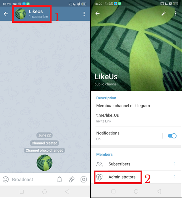 5. Kembali ke menu awal utama Telegram, buka channel Telegram yang baru saja dibuat. Klik ikon profil channel Telegram. Cari dan pilih ‘Administator’.