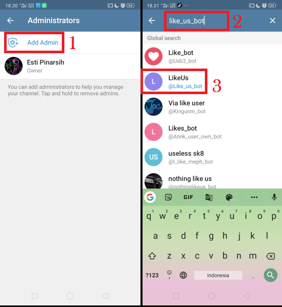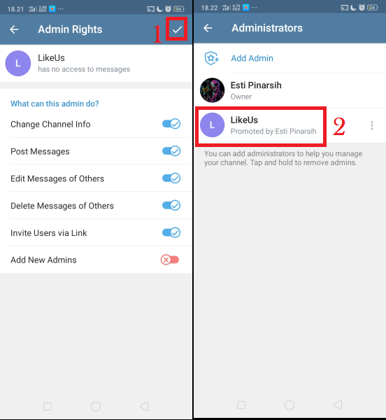 Di kolom pencarian, cari bot yang sudah dibuat sebelumnya. Klik centang untuk membuat bot menjadi admin. Klik ikon back untuk kembali.
