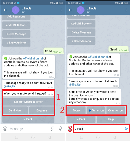 Kemudian Telegram akan menanyakan kapan kamu ingin mengirim post atau pesan tersebut. Klik ‘Send Now’ untuk mengirimkan post/pesan sekarang atau klik ‘Enqueue’ untuk menjadwalkan pesan. Pilih Enqueue. Pilih waktu dan ketikkan pukul berapa post/pesan mau dikirim.