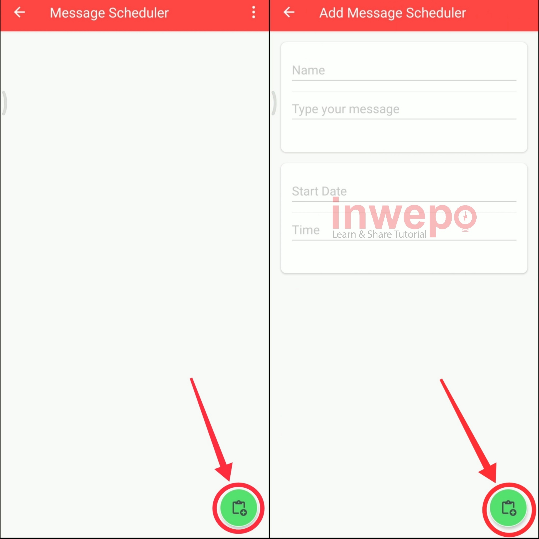 4. Langkah keempat, tuliskan pesan kamu pada kolom Type your message lalu untuk mengatur jam dan tanggal pada kolom Start date dan Time. Jika sudah semua tap icon plus lagi yang berada di bawah. Nah, untuk membuat status warna langsung saja kembali ke layar awal dan tap icon bubble lagi.