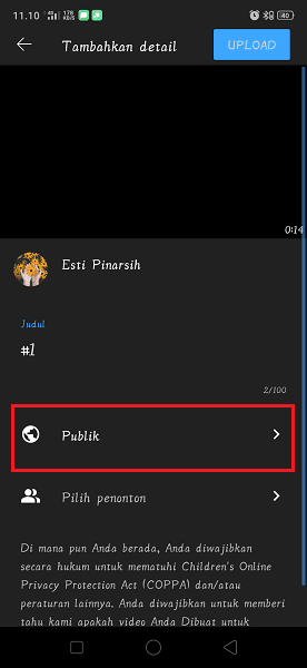 1. Tekan ikon + di halaman utama aplikasi YouTube dan kemudian buat video Shorts YouTube seperti biasanya. Pada halaman upload video, tekan ikon panah kanan pada fitur Publik untuk menampilkan beberapa pilihan fitur publikasi upload video.