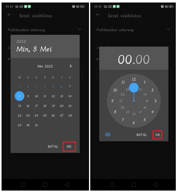 3. Atur tanggal dan hari upload video Shorts YouTube, tekan Ok. Kemudian, atur waktu/jam upload video Shorts YouTube dan tekan Ok.
