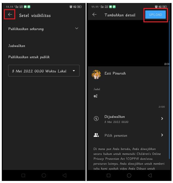 4. Setelah hari dan waktu upload video Shorts YouTube selesai diatur, tekan ikon back untuk kembali kehalaman upload video. Beri judul video dan atur pengaturan video lainnya, kemudian tekan Upload untuk mengupload video Shorts YouTube kamu.