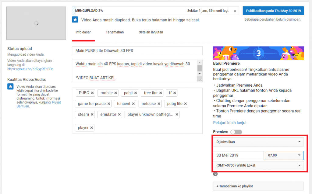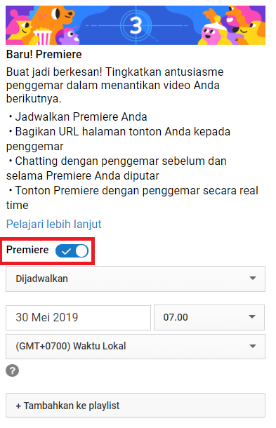 3. Pada saat proses pengunggahan video, kamu pada tombol publik dan ubah menjadi dijadwalkan, maka akan muncul kolom baru dimana kamu harus mengatur kapan video ini akan ditampilkan di Youtube secara publik, silahkan kamu atur sesuai yang kamu inginkan.