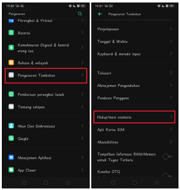 1. Buka menu Pengaturan pada HP Realme kamu masing-masing. Scroll kebawah pada halaman Pengaturan, dan cari menu Pengaturan Tambahan. Kemudian, scroll kebawah pada halaman Pengaturan Tambahan, dan cari menu Hidup/Mati Otomatis.