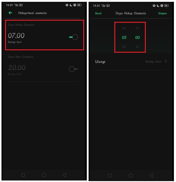 2. Pada halaman Hidup/Mati Otomatis, kita bisa mengatur waktu HP Realme menyala otomatis dan mengatur waktu HP Realme mati otomatis. Untuk mengatur waktu hidup otomatis pada HP Realme kami, aktifkan Daya Hidup Otomatis. Atur waktu hidup otomatis dengan cara tap waktu/jam hidup. Pilih pukul berapa HP Realme kamu akan hidup secara otomatis.