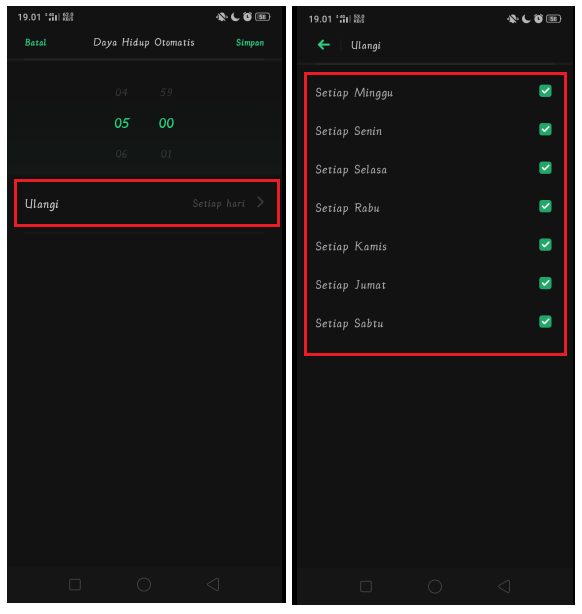 3. Kamu juga bisa mengatur hari apa saja, HP Realme kamu akan hidup secara otomatis. Tap ikon panah kanan pada menu Ulangi dan kemudian beri check list pada hari yang dipilih sesuai dengan kebutuhan kamu. Tap ikon Back untuk kembali ke Daya Hidup Otomatis dan tap tombol Simpan untuk menyimpan pengaturan diatas. Selesai, kini kamu sudah mengaktifkan fitur hidup otomatis di HP Realme kamu.