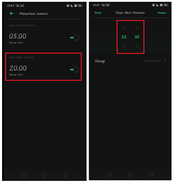 4. Sedangkan, untuk mematikan otomatis HP Realme caranya sama dengan mengaktifkan fitur hidup otomatis pada HP Realme. Aktifkan terlebih dahulu fitur Daya Mati Otomatis dan kemudian pilih waktu/pukul serta pilih hari HP Realme kamu akan mati secara otomatis. Tap tombol Simpan pada halaman Daya Mati Otomatis. Selesai, kini kamu sudah mengaktifkan fitur mati otomatis di HP Realme kamu.