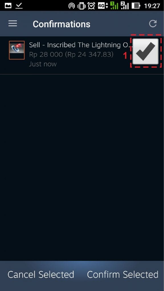 9. Setelah itu akan muncul daftar item atau barang game yang sebelumnya ingin kamu jual. Klik logo kotak di sebelah kanan item hingga muncul tanda centang. Langkah selanjutnya yaitu tekan confirm selected.
