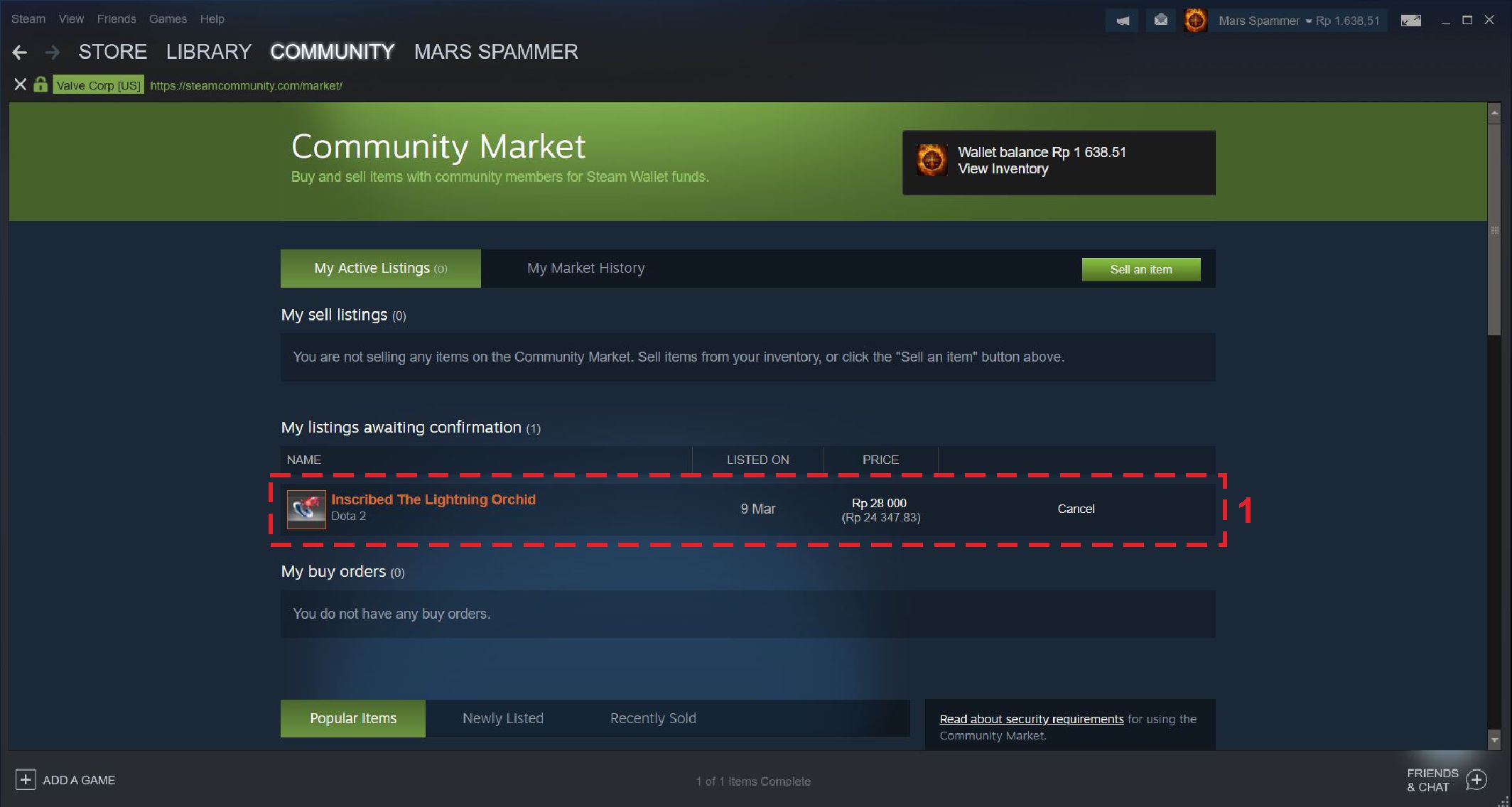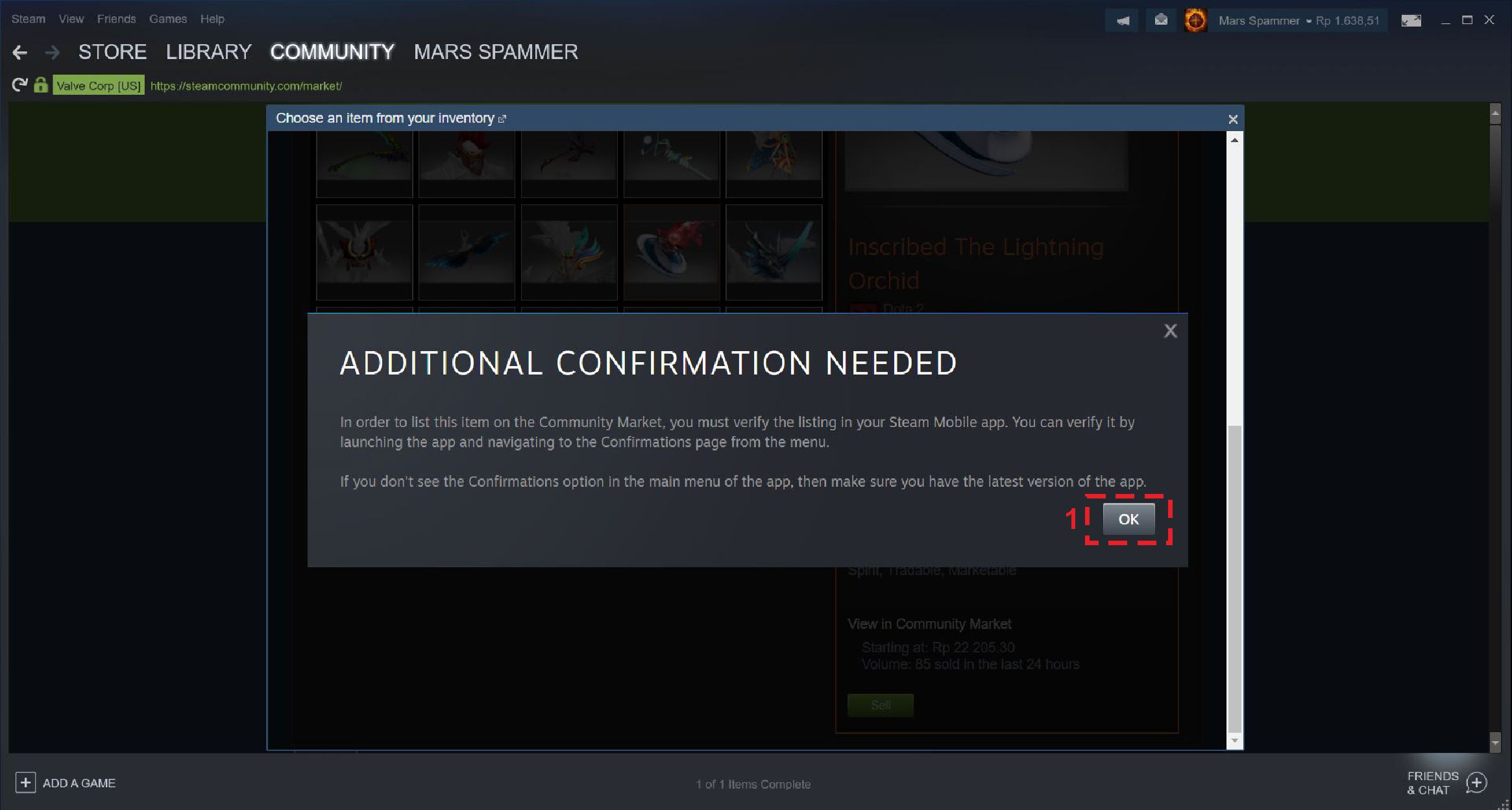Pada saat itu, item yang kamu ingin jual belum masuk ke dalam market dikarenakan perlu adanya konfirmasi menggunakan steam mobile app.