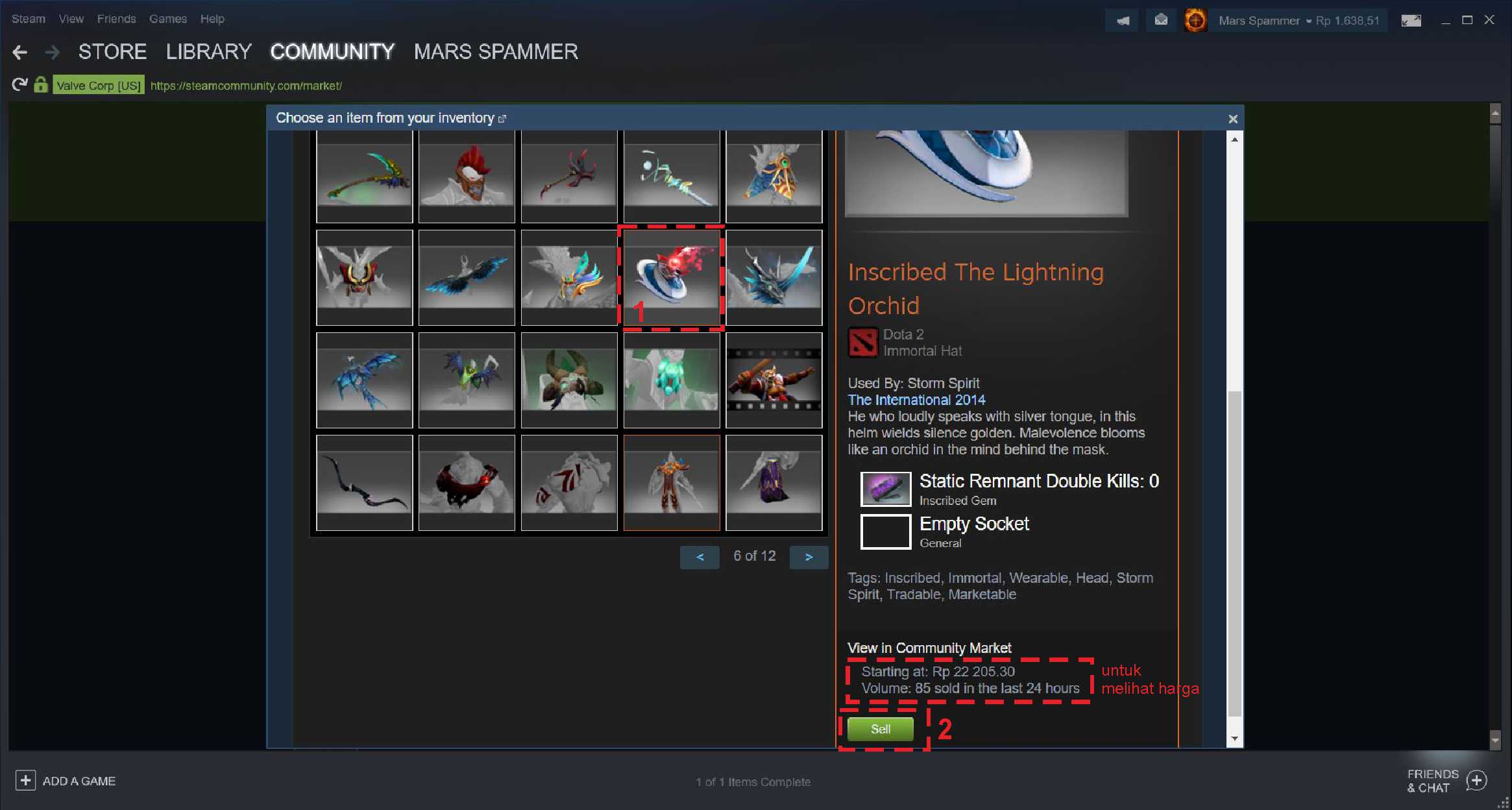 4. Pilih item atau barang yang ingin dijual, pada barang tersebut nantinya juga tertera harga item tersebut di market pada saat ini. Apabila sudah dipilih tekan sell.