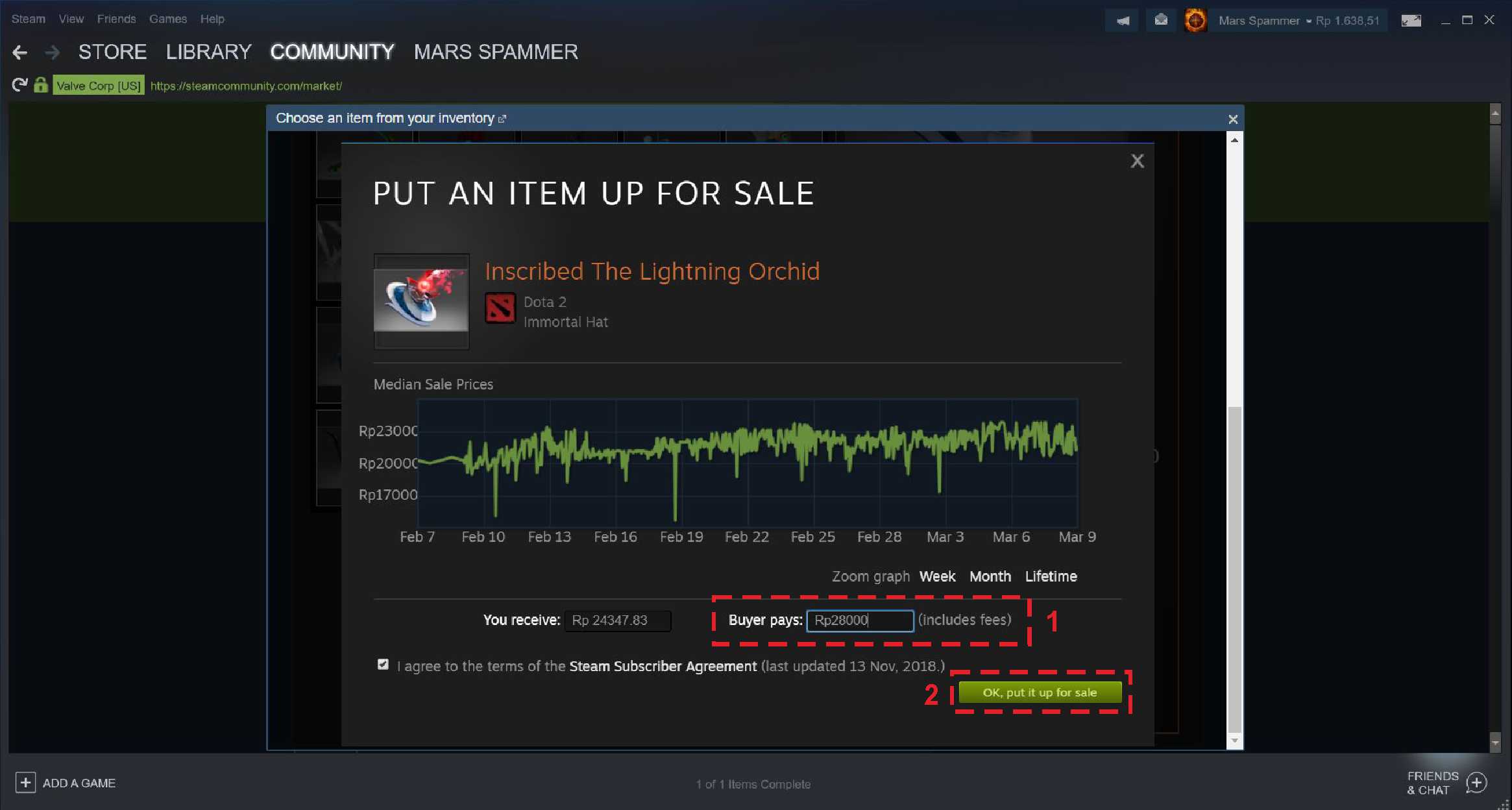 5. Tentukan harga item yang ingin kamu jual. Setelah memasukkan nominal harganya kemudian klik OK, put it up for sale.