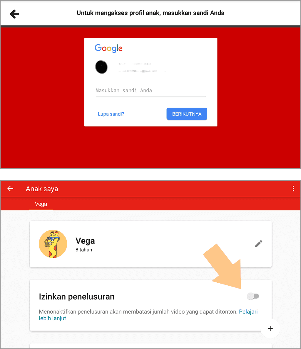 5. Masukkan kata sandi Gmail yang digunakan untuk membuat akun Youtube Kids, kemudian nonaktifkan fitur penelusuran.