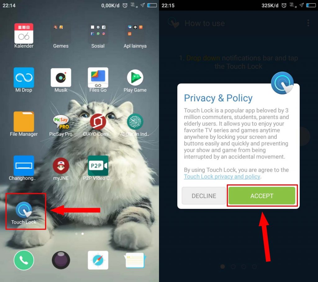 Langkah kedua, saat aplikasi sudah terinstall dengan baik buka aplikasi Touch Lock. Sewaktu pertama kali dibuka akan ada notif Privacy & Policy, tap ACCEPT.