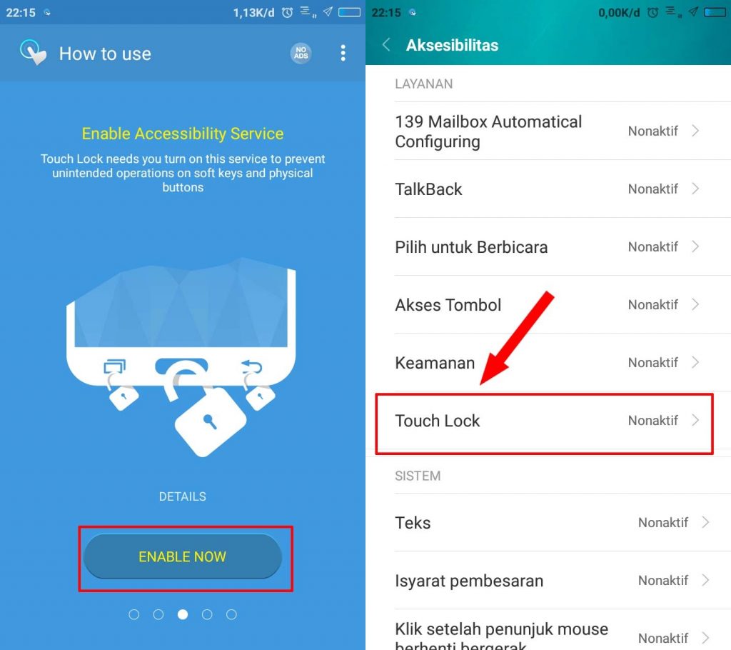 Langkah ketiga, selanjutnya tap ENABLE NOW pada laman untuk mengaktifkan aksebilitas kemudian pilih Touch Lock.