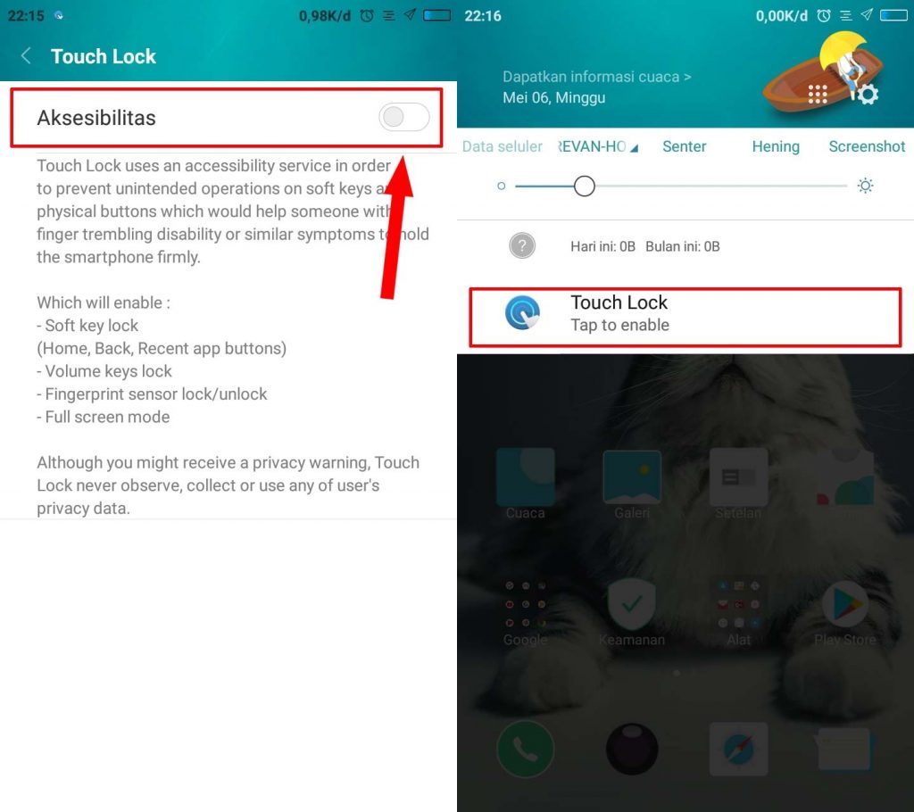 Langkah keenam, tarik lagi ke bawah notification bar dan pilih Touch Lock. Bila sudah terkunci dengan baik akan ada gambar bulatan dengan garis kunci di pinggir saat kamu menyentuh bagian mana saja di Touchscreen smartphone kamu.