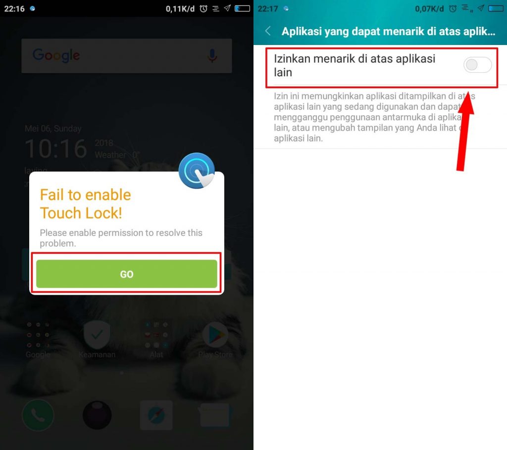 Langkah kelima, akan muncul notif Fail to enable tap saja Go selanjutnya geser kekanan tombol Izinkan menarik di atas aplikasi lain.
