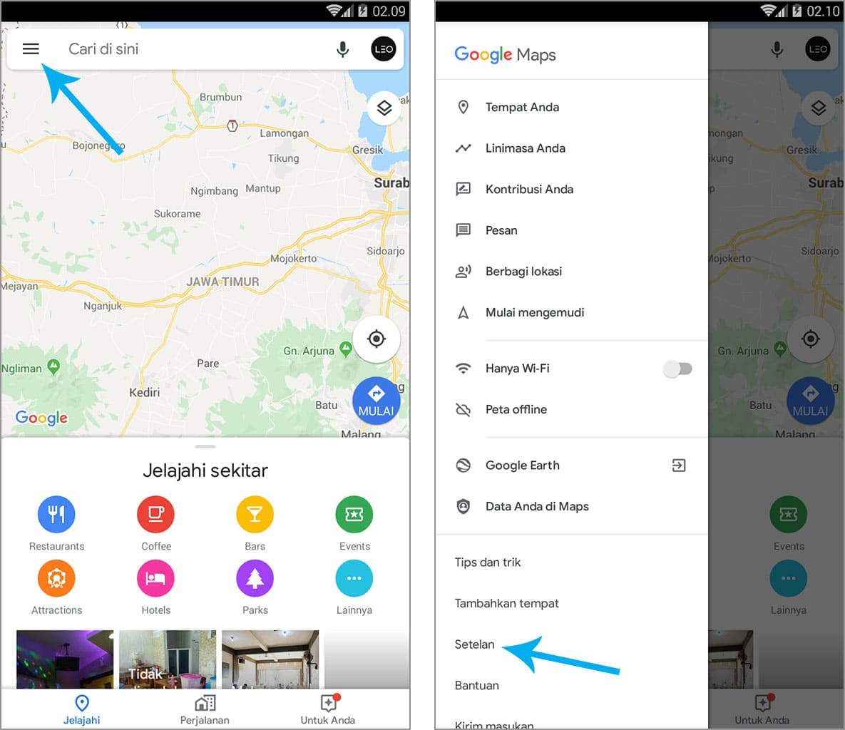 2. Ketuk tiga garis horizontal yang terletak di pojok kiri atas, kemudian pilih setelan.