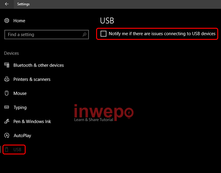2. Klik USB – Hilangkan centang pada Notify me if there are issues connecting to USB devices.