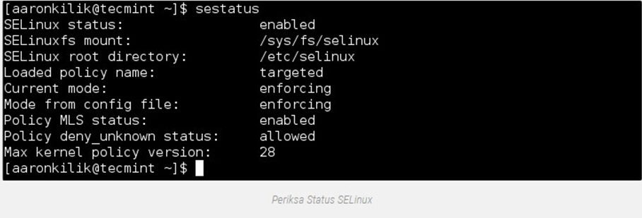 Hal pertama yang harus dilakukan adalah memeriksa status SELinux pada sistem kamu, dan kamu dapat melakukan ini dengan menjalankan perintah berikut: