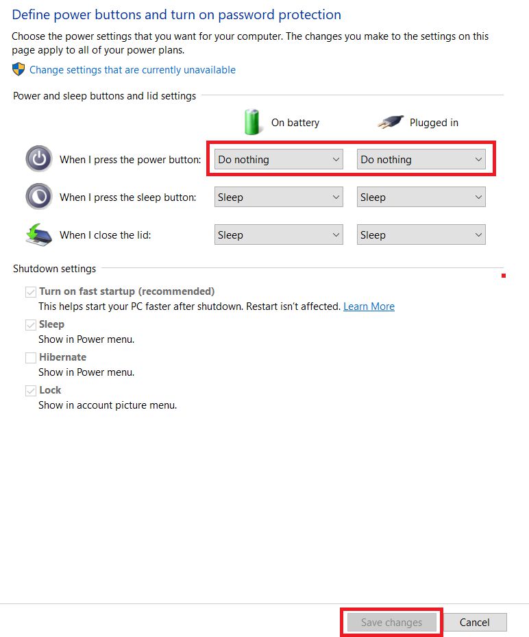 5. Di bagian pengaturan When i press the power button kamu ubah keduanya menjadi Do nothing lalu klik pada tombol Save changes.
