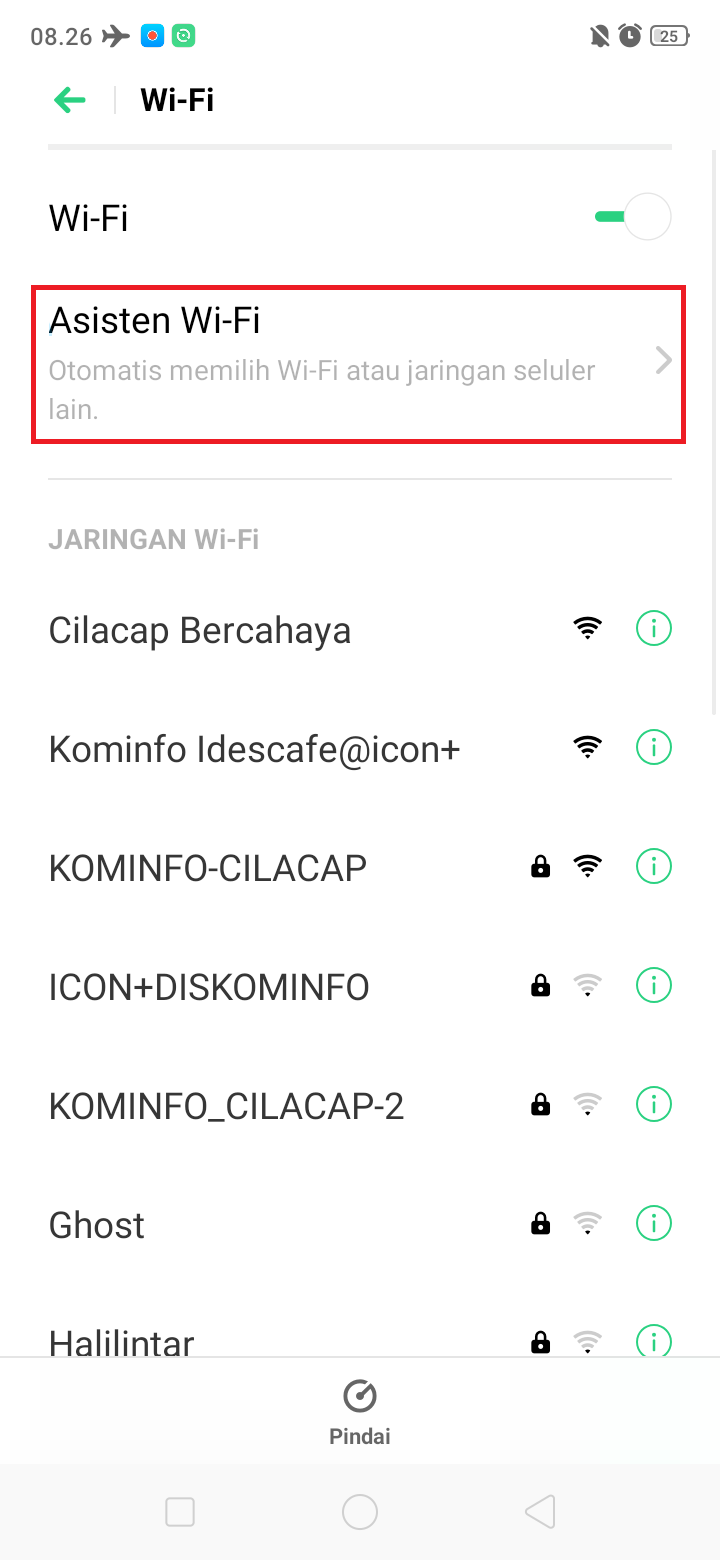 5. Agar HP Realme hanya memperlihatkan jaringan wi-fi terbaik saja, klik icon panah samping ‘Asisten Wi-Fi’.
