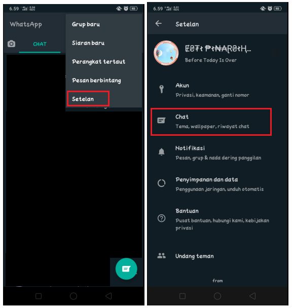 4. Untuk menampilkan kembali folder Diarsipkan di halaman utama aplikasi WhatsApp, pilih ikon titik tiga yang berada dipojok kanan atas halaman utama aplikasi WhatsApp, dan pilih menu Setelan. Dan, kemudian pilih menu Chat.