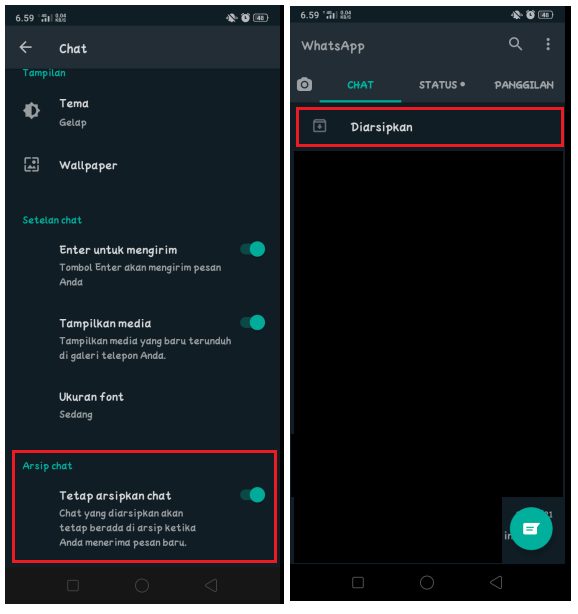 5. Scroll kebawah halaman Chat, dan cari kolom Arsip Chat. Aktifkan kembali fitur Tetap arsipkan chat. Selesai, kini folder Arsipkan sudah muncul kembali di halaman utama aplikasi chatting WhatsApp.