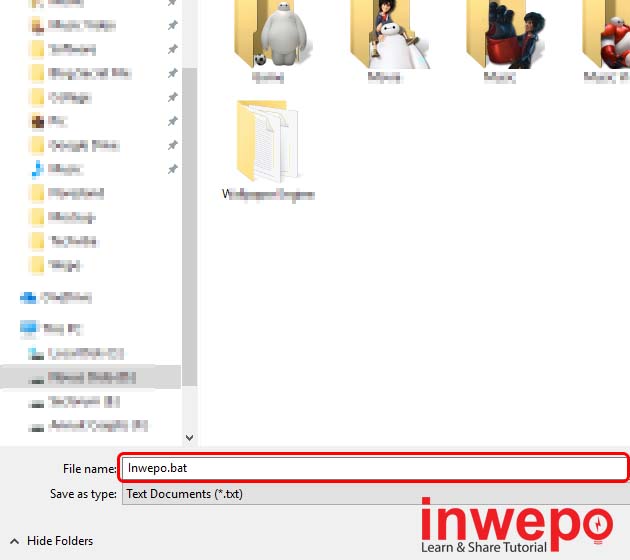 2. Lalu simpan / save file tersebut – Simpan file tersebut dengan nama yang kamu suka – tambahkan .bat setelah nama file tersebut.