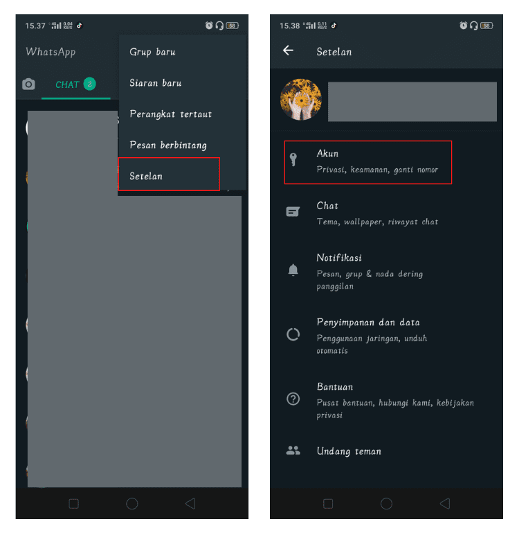 2. Pada halaman utama aplikasi WhatsApp, klik ikon tiga titik disisi kanan atas dan kemudian pilih menu Setelan. Dan; kemudian pada halaman Setelan, cari dan pilih menu Akun.