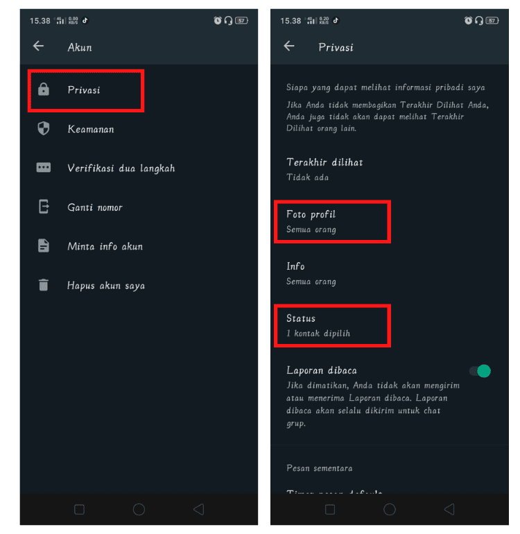 3. Di halaman Akun, pilih menu Privasi. Pada halaman Privasi ini terdapat menu Foto Profile dan Status.