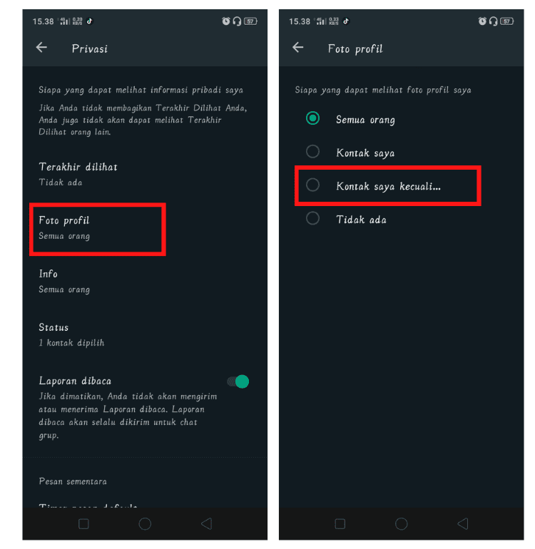 4. Untuk menyembunyikan foto profile dari beberapa pengguna, klik pada menu Foto Profile dan kemudian pilih Kontak saya, kecuali…