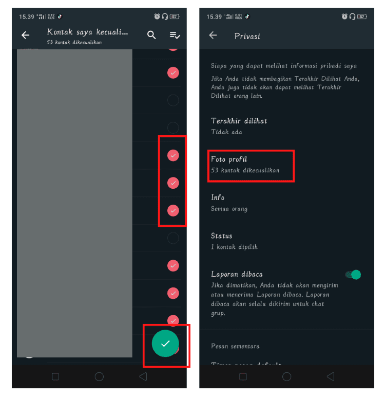 5. Beri centang pada kontak-kontak WhatsApp yang ingin kamu sembunyikan foto profile kamu. Untuk kontak yang tidak kamu beri centang; maka foto profile kamu akan tetap muncul pada kontak tersebut. Klik ikon centang disisi kanan bawah untuk menyimpan pengaturan tersebut. Selesai.
