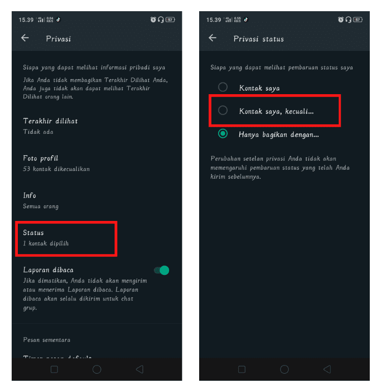6. Sedangkan untuk menyembunyikan status WhatsApp dari beberapa pengguna, klik pada menu Status dan kemudian pilih Kontak saya, kecuali…