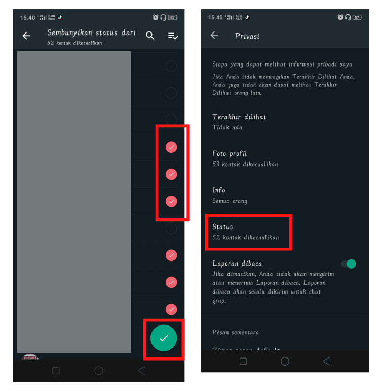 7. Beri centang pada kontak-kontak WhatsApp yang ingin kamu sembunyikan status WhatsApp kamu. Untuk kontak yang tidak kamu beri centang; maka status WhatsApp kamu akan tetap muncul pada kontak tersebut. Klik ikon centang disisi kanan bawah untuk menyimpan pengaturan tersebut. Selesai.