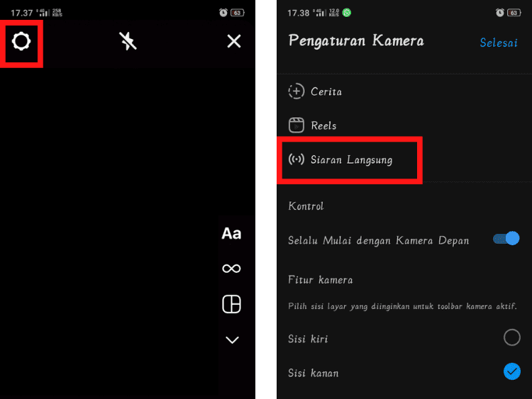 1. Buka aplikasi Instagram di perangkat android dan kemudian login menggunakan akun pribadi kita yang masih aktif. Buka menu Stories dan kemudian tap ikon Pengaturan atau Gerigi yang ada disisi kiri atas menu Stories untuk membuka menu Pengaturan Kamera.