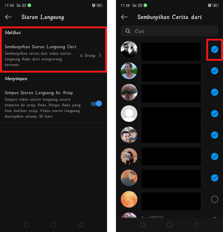 3. Pilih ikon panah kanan pada menu Sembunyikan siaran langsung dari. Dan, kemudian pilih salah satu atau beberapa akun Instagram lain. Atau, kita juga mencari akun Instagram tertentu dengan memanfaatkan kolom pencarian. Beri check list pada akun Instagram yang tidak boleh menonton/ melihat live streaming Instagram kita. Selesai, tap ikon Back dan kita bisa langsung membuat live streaming sesuai dengan konten yang sudah kita persiapkan sebelumnya.